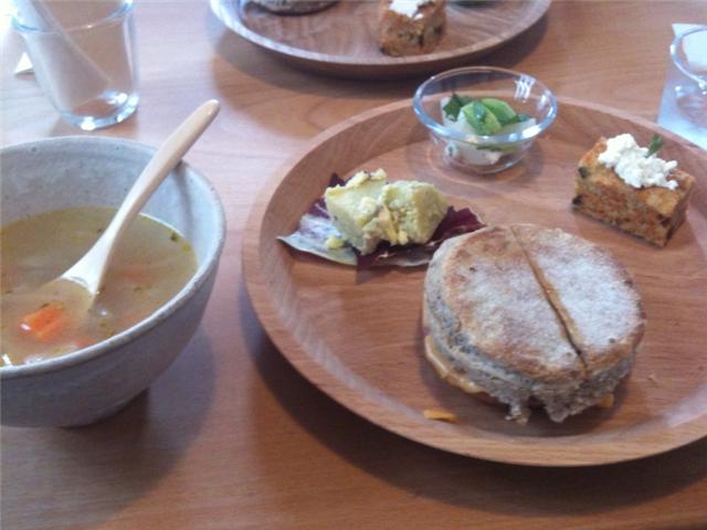 ランチのセット。このイングリッシュマフィンがたまらなく美味しい。体の中がきれいになりそうなメニュー。